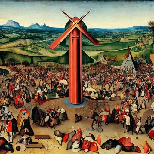 Elon Musk worshipping a giant X statue in the style of Pieter Bruegel the Elder