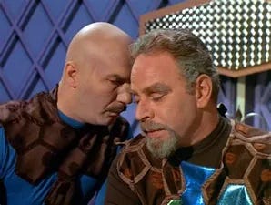 Compounding issues with the plot, even our heroes aboard the Enterprise aren’t thinking at their best. Spock is easily outmaneuvered and bamboozled by Hodin at each communication with the Gideon Council to find Kirk. So much so it appears, that Spock does not notice the differences in the beam-down coordinates provided by them. Normally, Spock would not be so uncharacteristically slow at noticing such things. And the good Captain, who knows his own ship so well, surely would have thought to check it thoroughly for any dissimilarities. (Would he wonder, perhaps, that he might been sent to another alternate universe, like in Mirror, Mirror?) But that aside, Kirk, as an experienced problem-solver, surely also should have come up with a better solution than suggesting birth control and sterilization! A man who’s visited countless planets, many unpopulated, but habitable worlds, and that’s the best he can do? The Kirk I think I know would have started out by advocating for a Federation-assisted evacuation. Would he not have begun arranging for the largest Federation transport ships available to make regular trips to other worlds for the people to live on? This is the space age, for crying out loud—there’s no need for an overcrowded world!