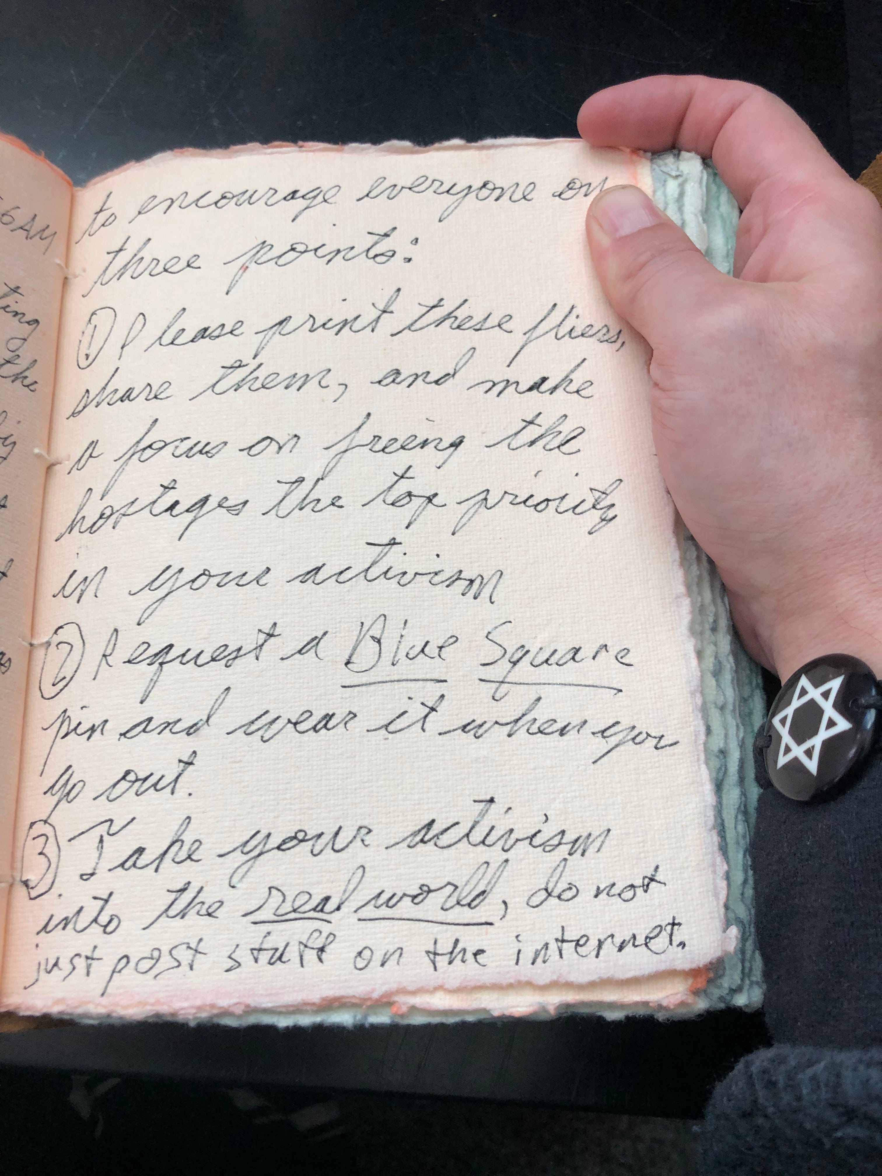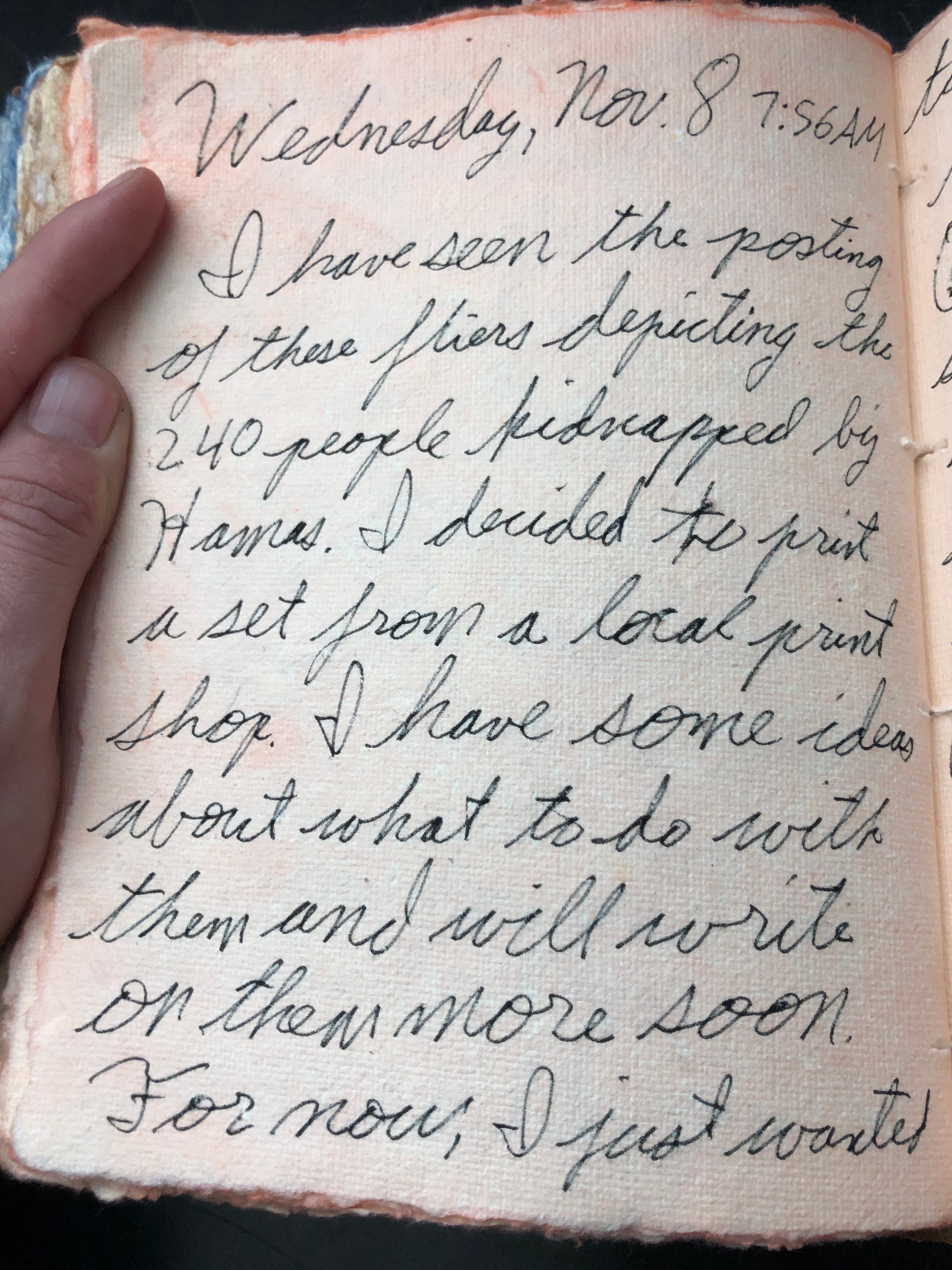 For those who can’t read my archaic cursive script above, and those who can, please allow me to point you toward two websites where you can get started in working to raise awareness about the 240 hostages kidnapped by Hamas and the 400% boom in antisemitism since 10/7.