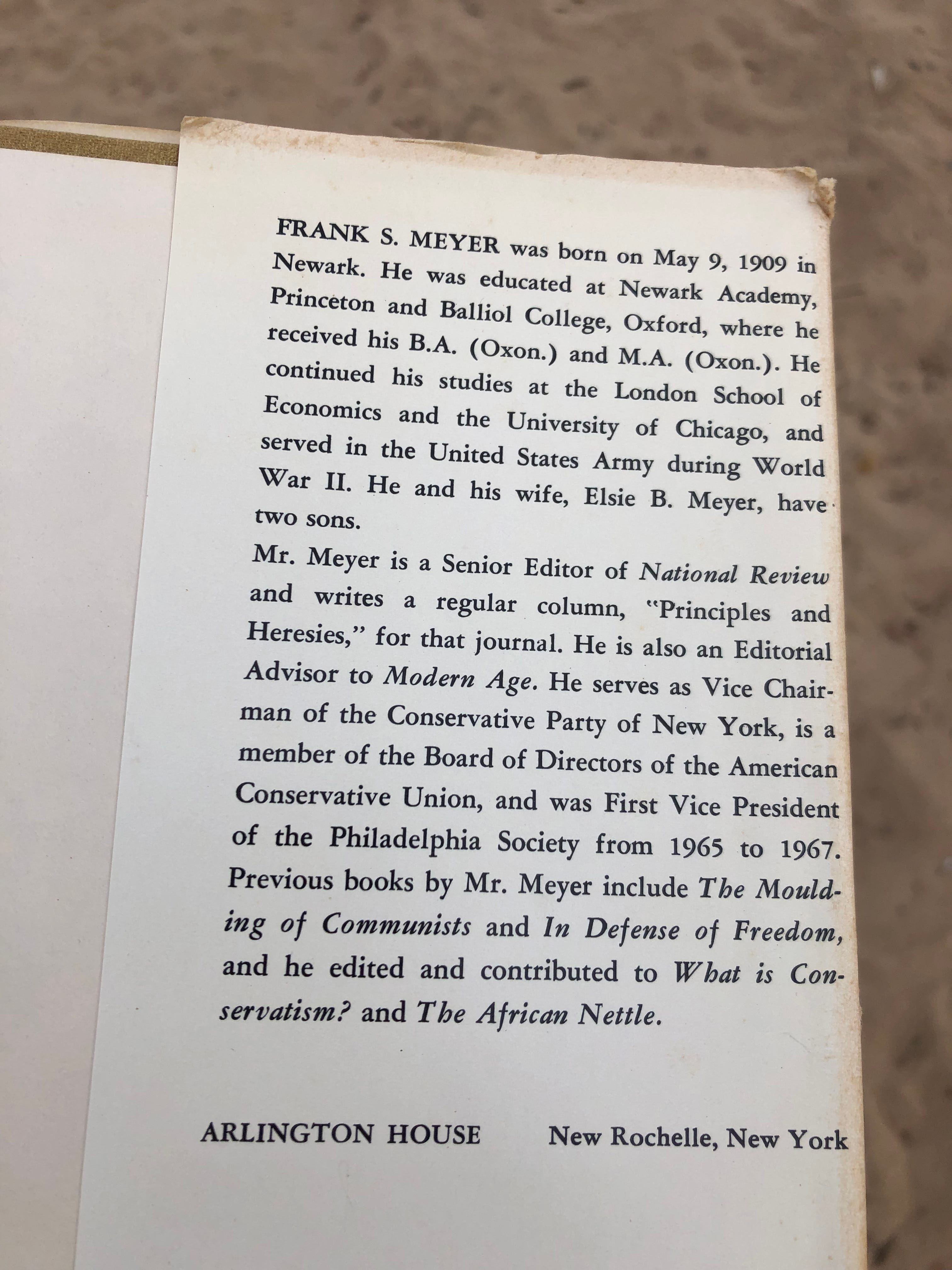 Frank S. Meyer (pictured above on the back cover from the book collecting his National Review columns published in 1969, with the included bio below) was the primary theorist who created this "conservative mainstream" ideologically, by balancing what was once called "traditionalism" (social conservatism) against what was once called "individualism" (libertarianism) and gluing them together with anti-communism. What is often described as “the three legged-stool of conservatism” goes back to him. He’s my favorite conservative philosopher - a simply wonderful writer - and classic ‘50s-early' ‘70s ideological operative. I’ve long regarded him as one of my career models. (His only major blindspot - which extended to the whole National Review crew as well as just about the whole 1960s Right - was that he really screwed up in his responses to the Civil Rights movement. Major failure there - which in a sense echoes how today’s right-wingers largely aren’t concerned about racism at all, more worrying about fuckin’ “CRT” and white people’s feelings being hurt hearing about the history of racism in this country.)