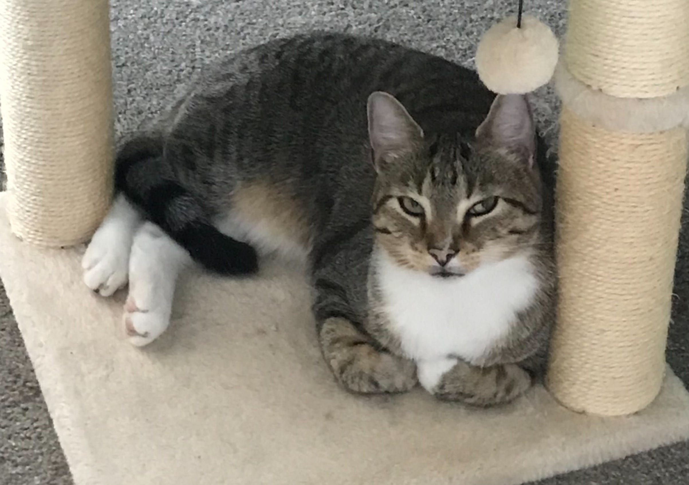 Kittyboo here again. I left off my last installment telling you that our home was about to have not two, but three cats living in it. Yeah, you’d think that having two cats was quite enough for one house, but I suppose when you hear what the reason was for adding another cat, you might think it’s okay. As it was explained in my hearing (I was trying to take a nap nearby when they were discussing it), Dad Ott’s brother decided they wanted to get another kitten, and they brought home a gray tabby mix that they named Spartacus, or “Sparty” for short.