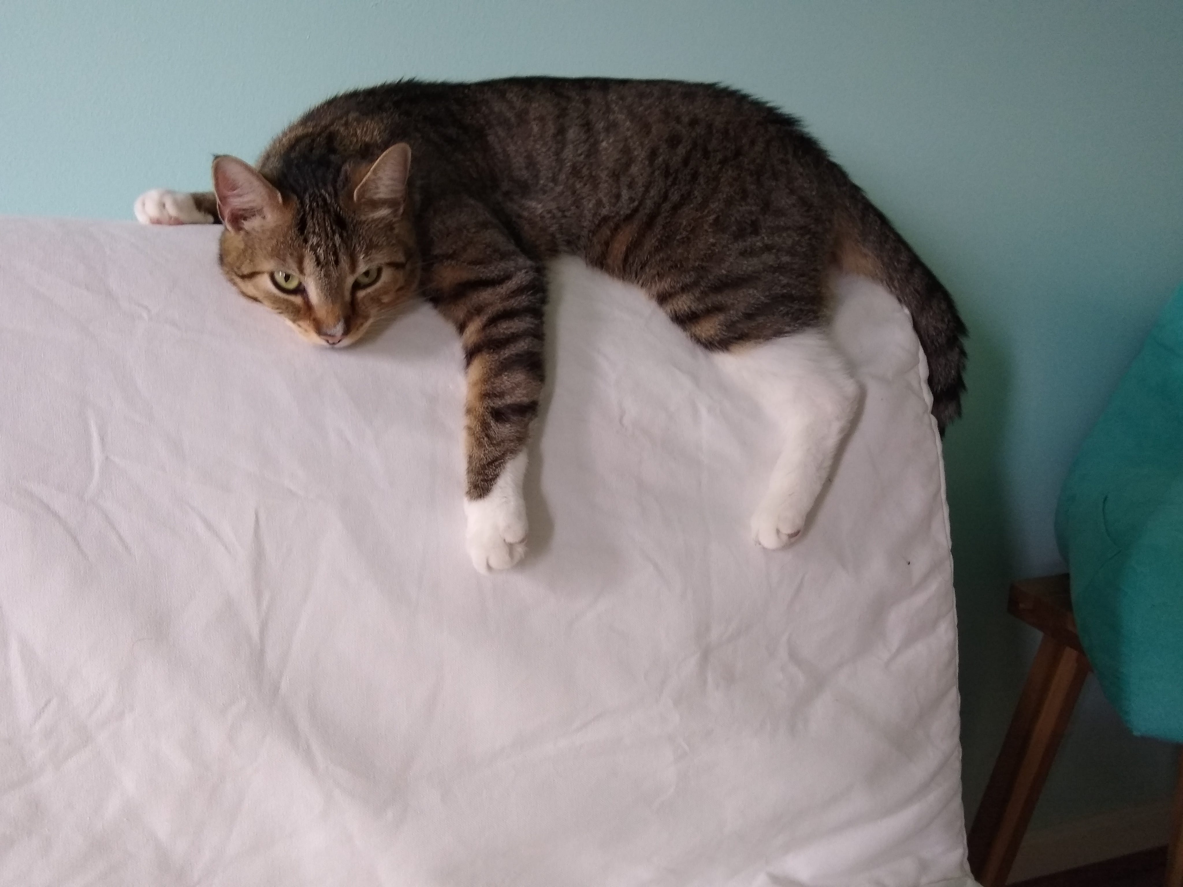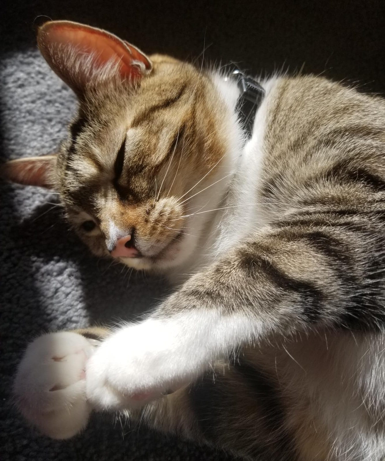 He quickly became every cat’s little brother. He’s just a simple guy who likes to present himself to you for a grooming. He likes to show people his fang as he rubs his cheek against you.