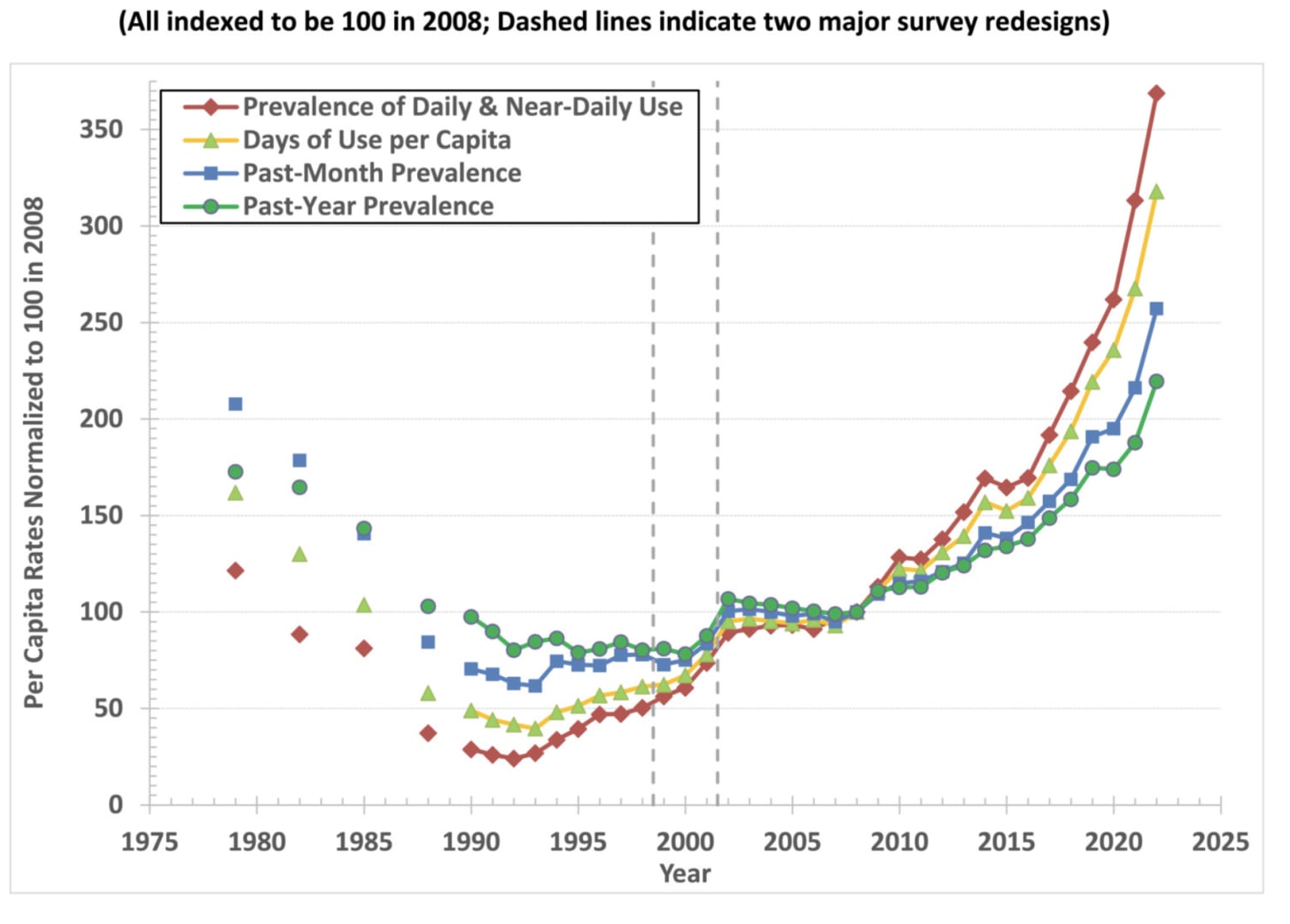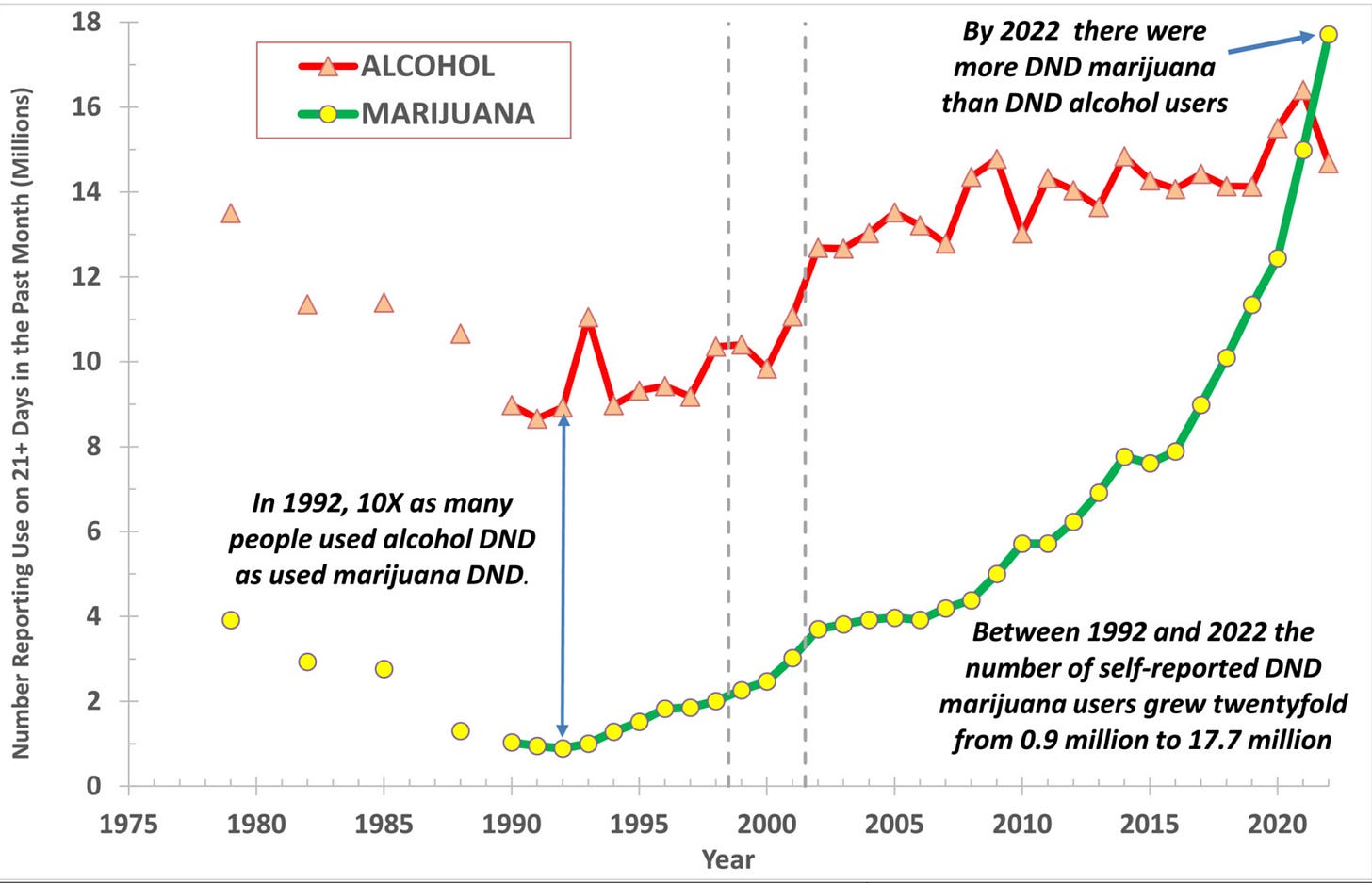 In 2024, Carnegie Mellon University published research depicted in the chart above, finding that in 2022 the number of daily cannabis users in American (17.7 million) had now surpassed daily alcohol users (14.7 million). This is a 15x increase from 1992 when 900,000 Americans admitted daily weed use, compared to 8.9 million daily drinkers.