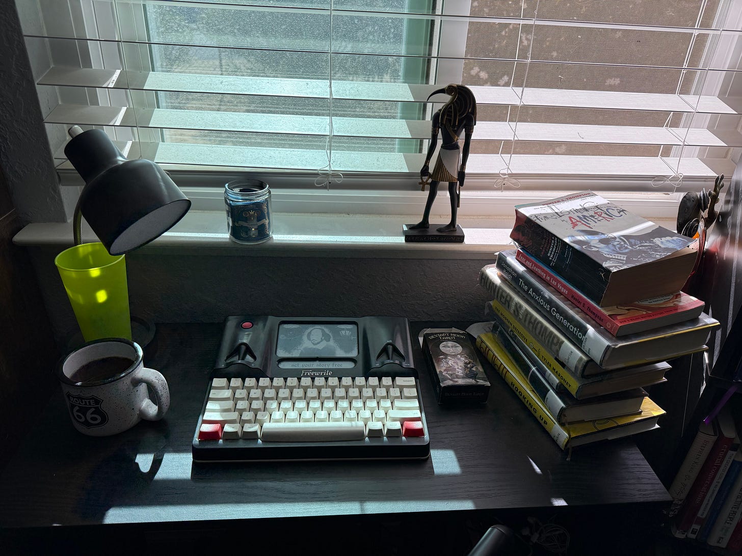 Once my brain’s moving and there are some ideas percolating in there, I come in here to my library and writing room, where I sit down at my Freewrite, a digital typewriter that I use for writing first drafts. (See the photo above for how my setup looks. I’ll usually pile a few books to my right intended to inspire the drafting.)