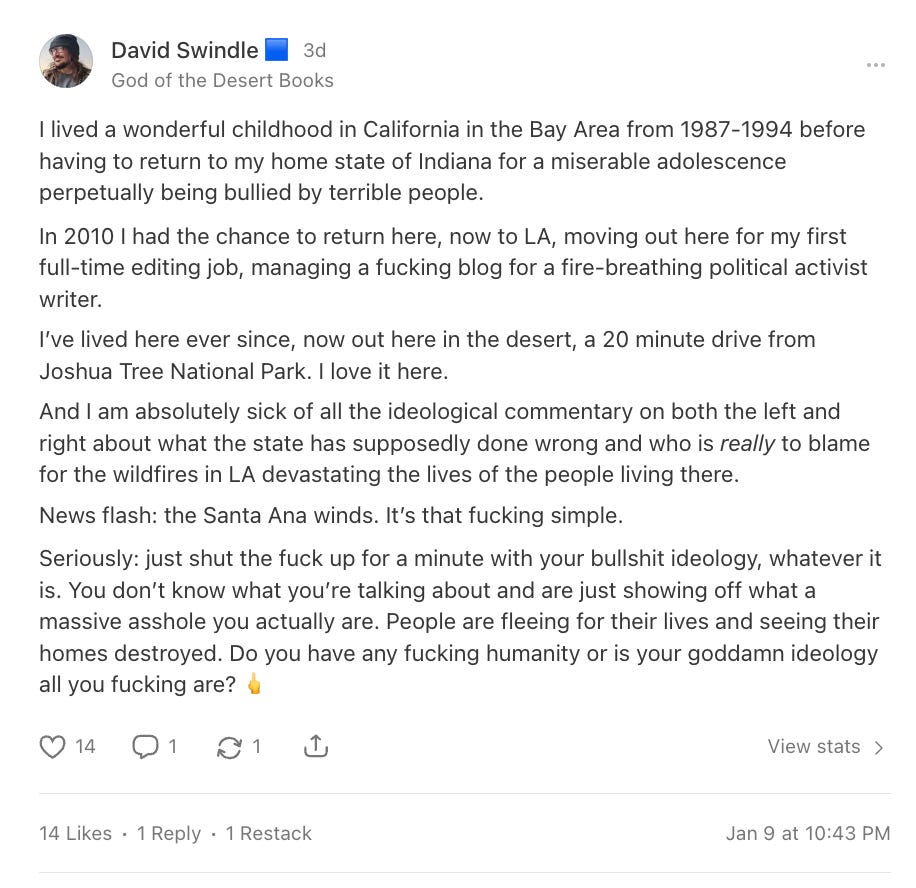 Now, I'm not saying everyone outside of California hates us. I know they don't. But a whole lot of people certainly do. And we see it in the widely varying reactions to the horrendous LA wildfires that still rage 160 miles away from us in Yucca Valley, where we live near the entrance of Joshua Tree National Park. For days, we’ve felt the intensity of the Santa Ana winds responsible for spreading the flames. Three times our power has gone out for at least two hours, apparently a preventive measure so the electric company can check to ensure no damage. And our town is strained to the point of overflow with frightened people fleeing the devastation a couple of hours to the west.